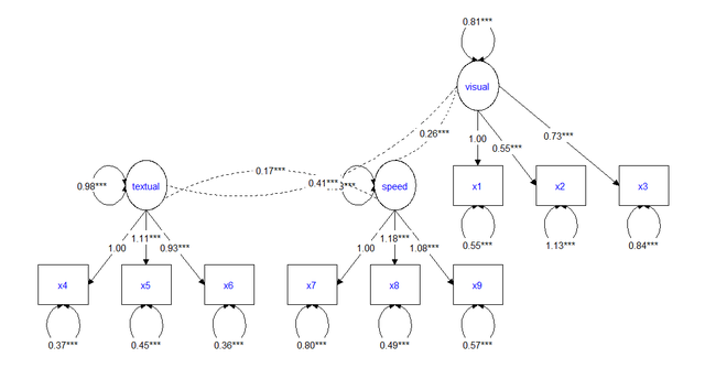 HS.model <- ' visual =~ x1 + x2 + x3textual =~ x4 + x5 + x6speed =~ x7 + x8 + x9 '