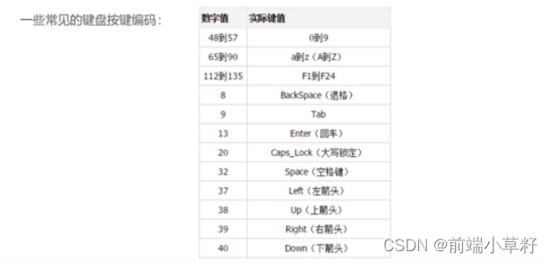 keyCode返回keydown和keyup事件发生的时候按键的代码,以及keypress 事件的Unicode字符(ASCII码值);(firefox2不支持 event.keycode,可以用 event.which替代 )