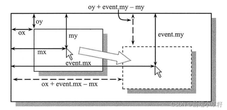 如上图所示,其中变量 ox 和 oy 分别记录按下鼠标时被拖放元素的纵横坐标值,它们可以通过事件对象的 offsetLeft 和 offsetTop 属性获取。变量 mx 和 my 分别表示按下鼠标时,鼠标指针的坐标位置。而 event.mx 和 event.my 是事件对象的自定义属性,用它们来存储当鼠标移动时鼠标指针的实时位置。