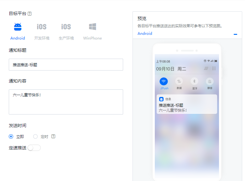 在控制台设置好推送内容,点击发送预览->确定即可推送