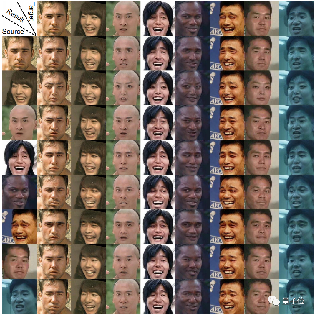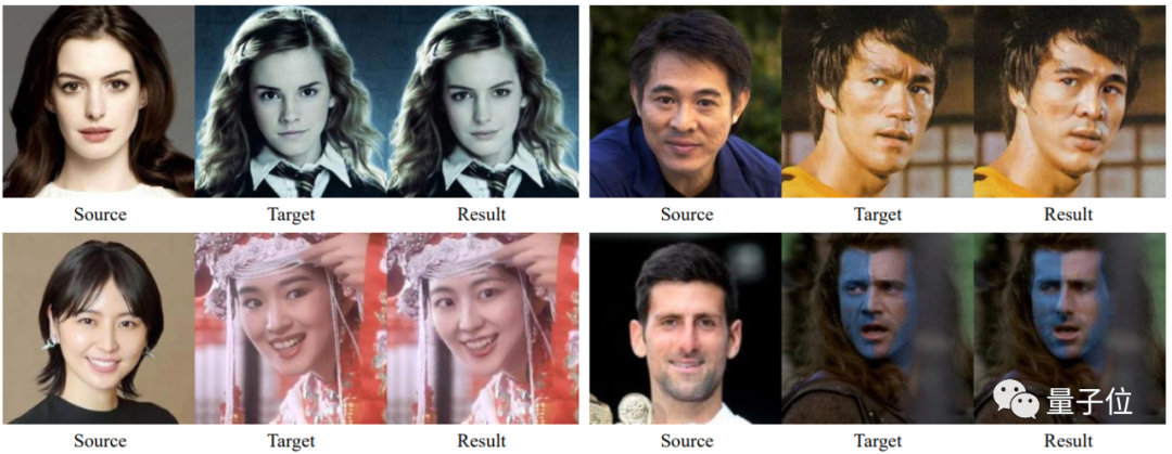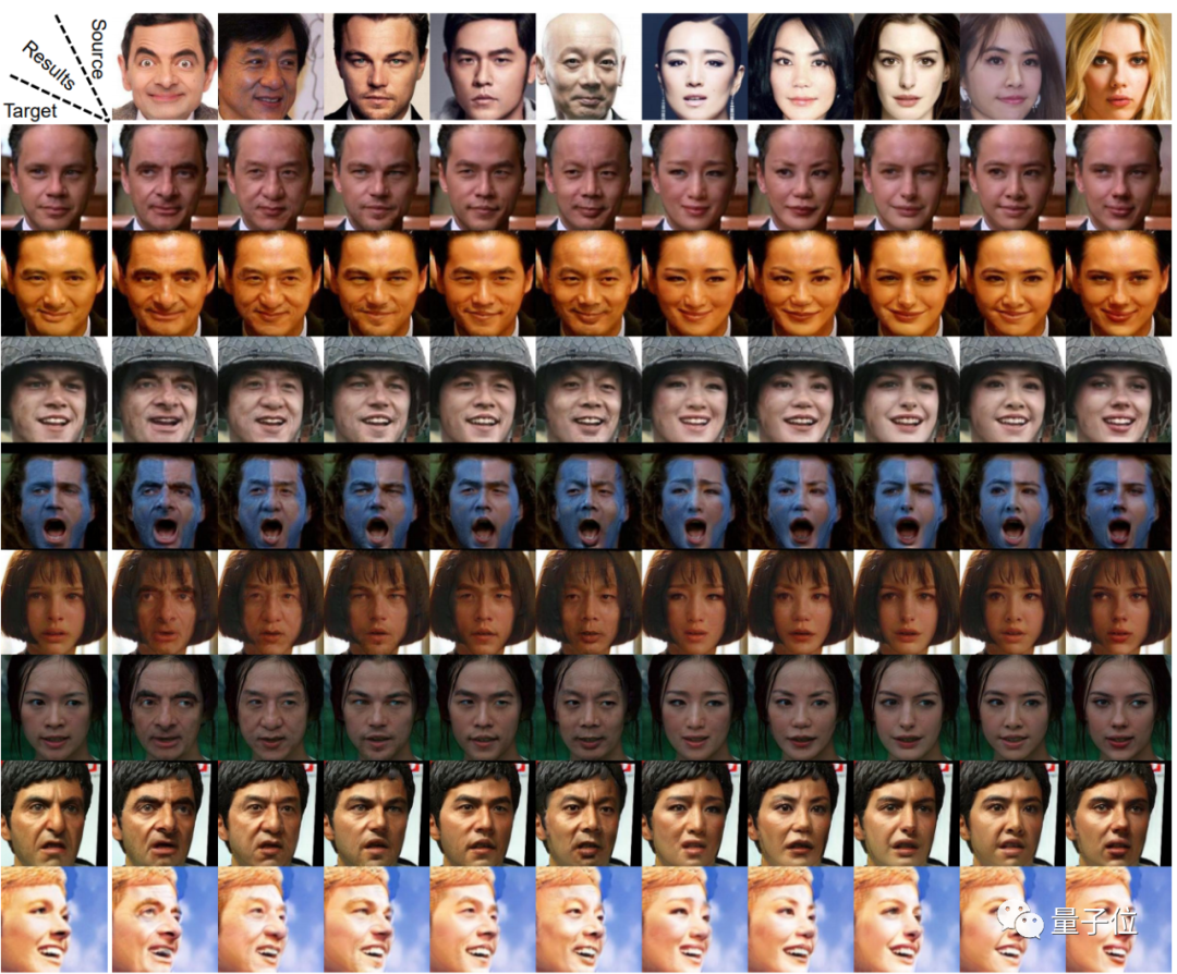 也就像我们在开头展示的那样,不用精挑细选“正脸”或“中性表情,直接从网上抓一把人物图片,也能够完美换脸。
