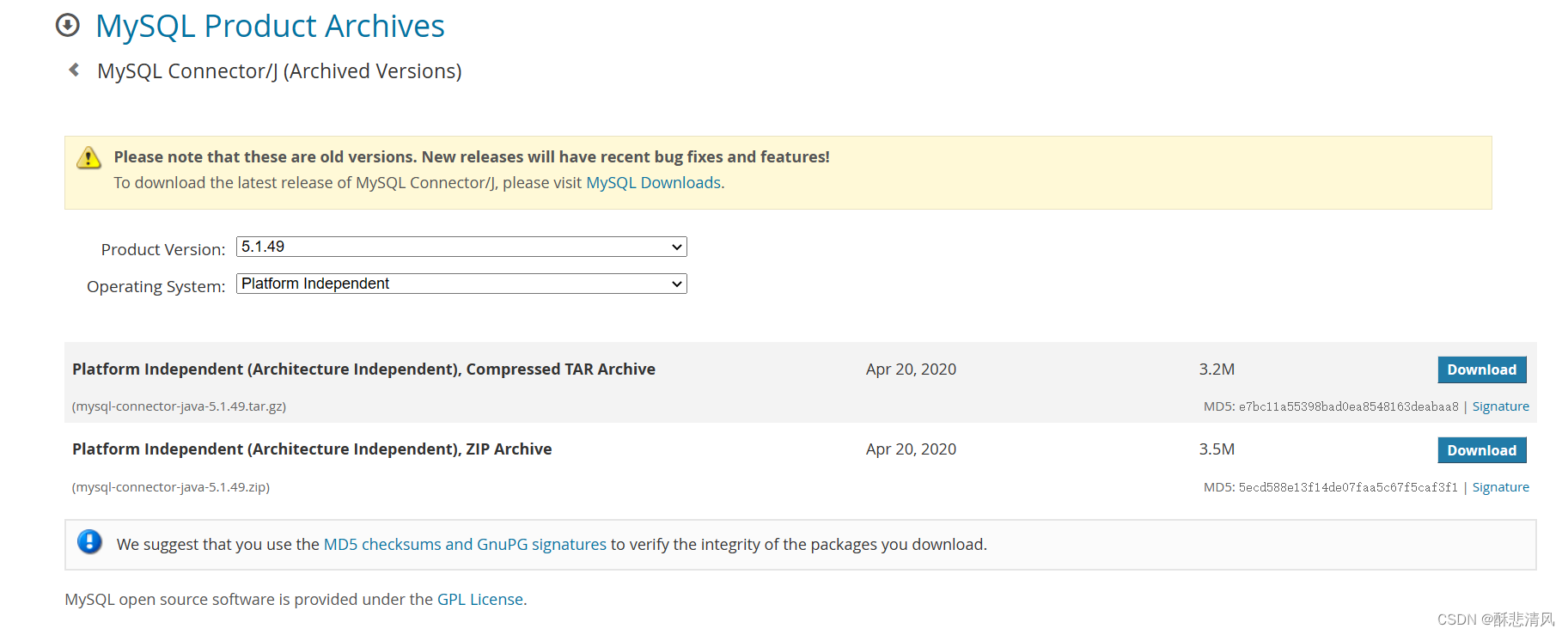 查看历史版本,选择自己mysql的版本,下载对应版本压缩包即可