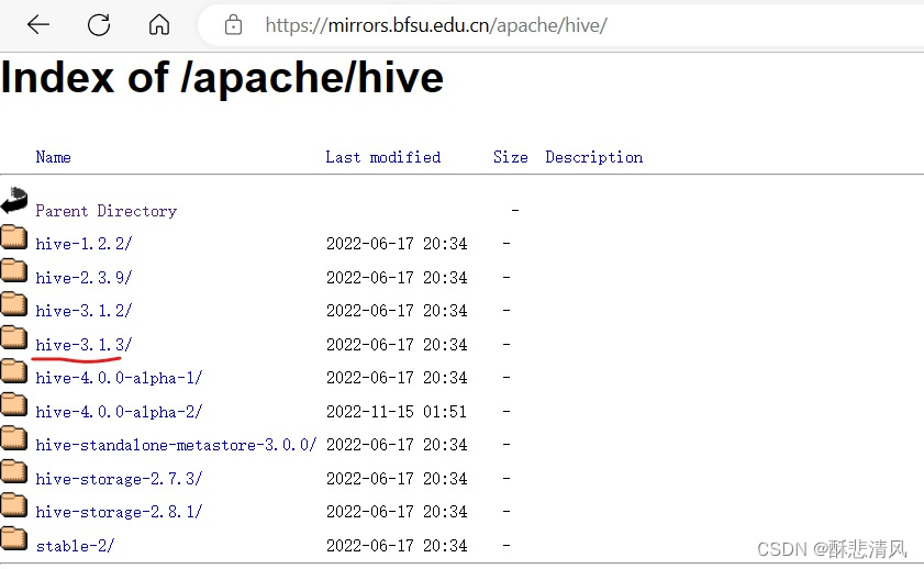 下载连接:下载连接: Index of /apache/hive(官网下载速度较慢,这里推荐使用国内镜像下载)