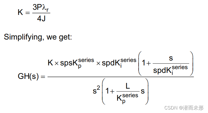 由上易知:该开环函数显示出系统为II型三阶系统,在s=0处有两个极点。此外,速度环PI控制带来了一个零点:s=j*spdKi_series,电流闭环带来了一个极点:s=j*Kp_series/L。
