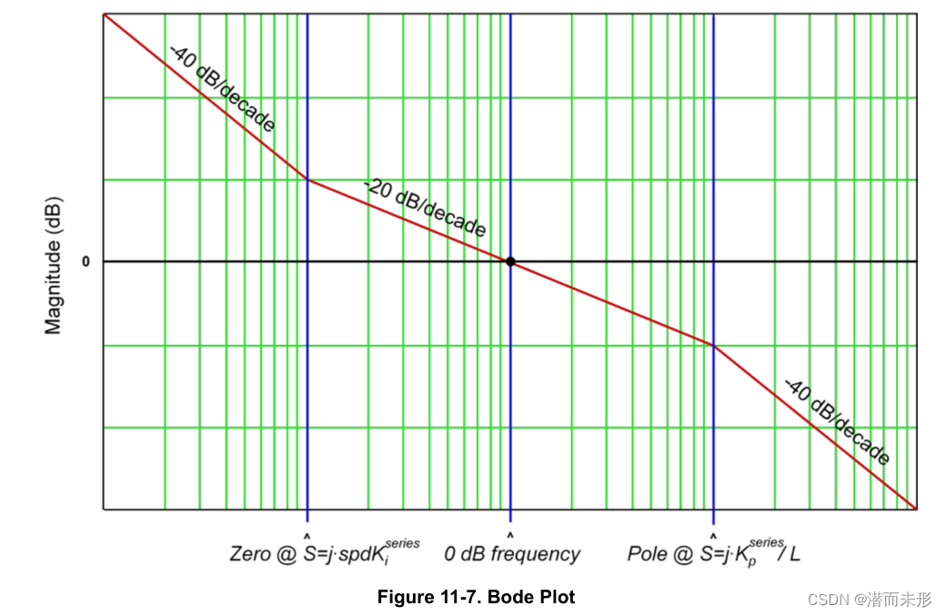 如伯德图所示,s=0处点有两个极点,该系统从零频开始每十倍频增益下降40dB。为了使得系统具有最大的相位裕度,零点必须在极点之前,0dB的点必须位于中频带(-20dB)的中间。