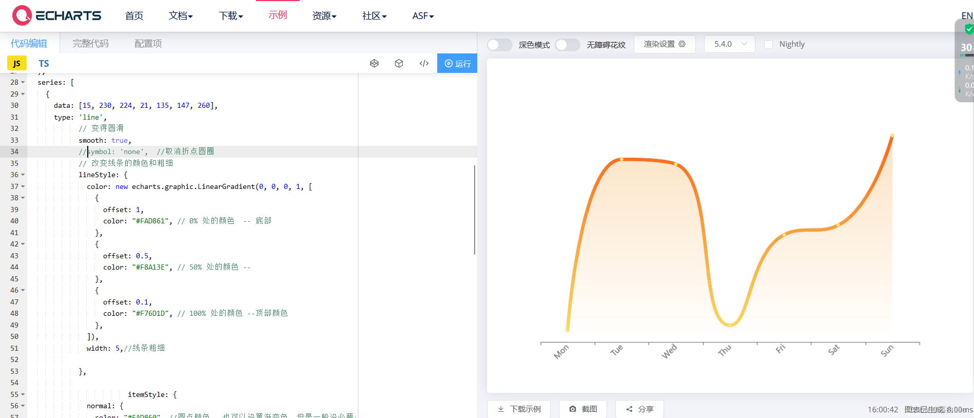 series: [{data: this.echartsData.num,type: "line",// 变得圆滑smooth: true,symbol: 'none', //取消折点圆圈// 改变线条的颜色和粗细lineStyle: {color: new echarts.graphic.LinearGradient(0, 0, 0, 1, [{offset: 1,color: "#FAD861", // 0% 处的颜色 -- 底部},{offset: 0.5,color: "#F8A13E", // 50% 处的颜色 --},{offset: 0.1,color: "#F76D1D", // 100% 处的颜色 --顶部颜色},]),width: 5,//线条粗细},},],