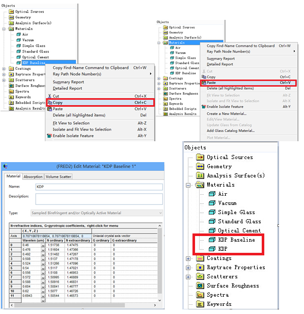 步骤2:复制KDP BaseLine到Materials树形文件夹下,具体操作为鼠标左键选中KDPBaseline,右键选择Copy,并在Materilas 下选择paste,并命名为KDP。