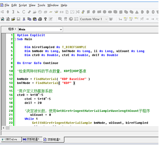 步骤4:在脚本编辑器中按下Ctrl +B运行脚本,最后我们观测KDP材料的折射率变化。或退出编辑器,在树形文件夹选择Run an Embedded Scripts...下运行脚本。