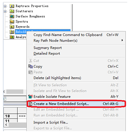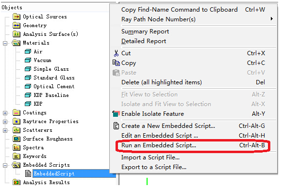 步骤3:创建一个折射率随温度变化20k后的折射率变化模型,我们利用FRED软件自带的VB脚本实现此功能。在树形文件夹选择Embedded Scripts,右键选择Create a New Embedded Scrips,注意删除脚本编辑器里面的所有内容,然后粘贴如下的程序到此编辑器中。