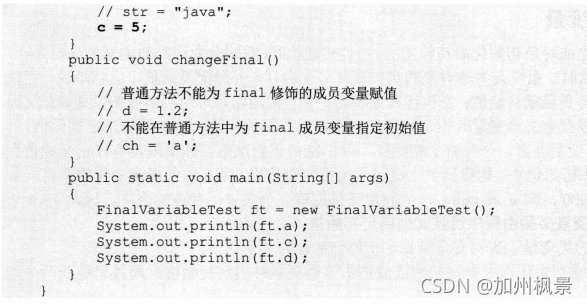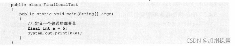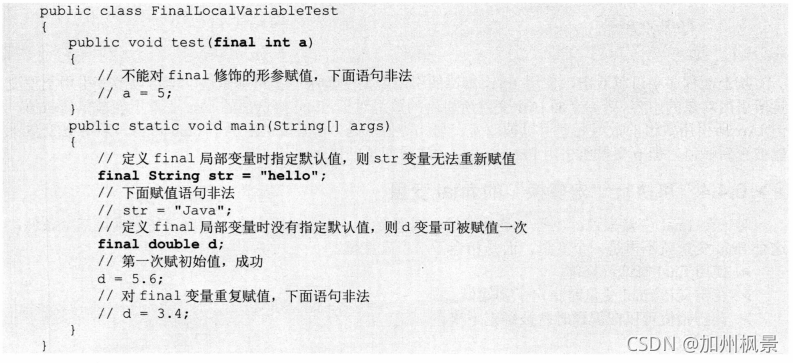 在上面程序中还示范了final 修饰形参的情形。因为形参在调用该方法时,由系统根据传入的参数来完成初始化,因此使用final修饰的形参不能被赋值。