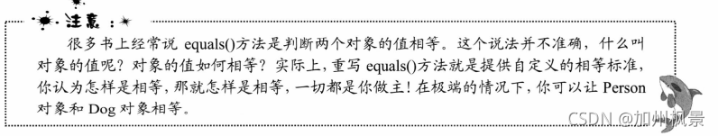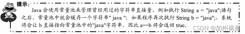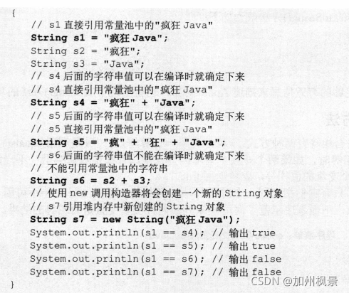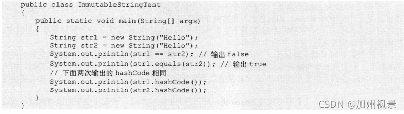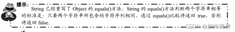 但在很多时候, 程序判断两个引用变量是否相等时,也希望有一种类似于 “值相等”的判断规则,并不严格要求两个引用变量指向同一个对象。例如对于两个字符串变量,可能只是要求它们引用字符串对象里包含的字符序列相同即可认为相等。此时就可以利用String对象的equals()方法来进行判断,例如.上面程序中的str1.equals(tr2)将返回true。