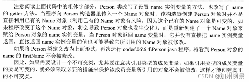 前面介绍final 关键字时提到,当使用final 修饰引用类型变量时,仅表示这个引用类型变量不可被重新赋值,但引用类型变量所指向的对象依然可改变。这就产生了一个问题:当创建不可变类时,如果它包含成员变量的类型是可变的,那么其对象的成员变量的值依然是可改变的----这个不可变类其实是失败的。
