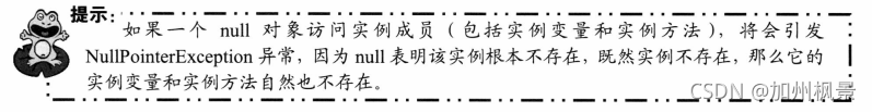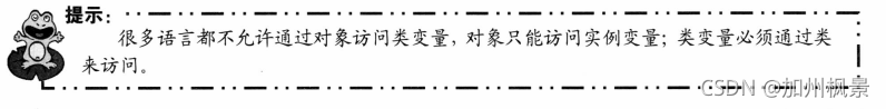 对static 关键字而言,有一条非常 重要的规则:类成员(包括方法、初始化块、内部类和枚举类)不能访问实例成员(包括成员变量、方法、初始化块、内部类和枚举类)。因为类成员是属于类的,类成员的作用域比实例成员的作用域更大,完全可能出现类成员已经初始化完成,但实例成员还不曾初始化的情况,如果允许类成员访问实例成员将会引起大量错误。