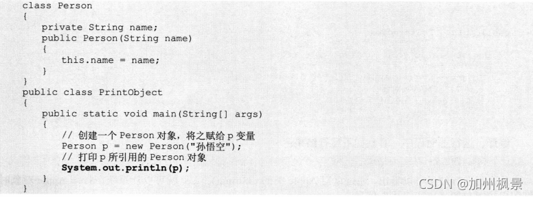 上面程序创建了一个 Person对象,然后使用System.out.println()方法输出Person 对象。编译、运行上面程序,看到如下运行结果: .