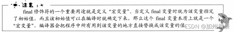 上面程序中粗体字代码定义了4个final变量,程序为这4个变量赋初始值指定的初始值要么是算术表达式,要么是字符串连接运算。即使字符串连接运算中包含隐式类型(将数值转换为字符串)转换,编译器依然可以在编译时就确定a、b、str、 book 这4个变量的值,因此它们都是“宏变量”。