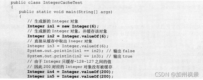 运行上面程序,即可发现两次通过Integer.valueOf(6);方法生成的 Integer对象是同一个对象。但由于Integer 只缓存-128~127之间的Integer对象,因此两次通过Integer.valueOf(200);方法生成的Integer对象不是同一个对象。