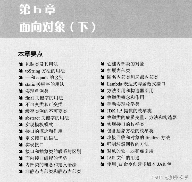 - abstract和 interface两个关键字分别用于定义抽象类和接口,抽象类和接口都是从多个子类中抽象出来的共同特征。但抽象类主要作为多个类的模板,而接口则定义了多类应该遵守的规范。Lambda表达式是Java 8的重要更新,本章将会详细介绍Lambda表达式的相关内容。enum关键字用于创建枚举类,枚举类是一种不能自由创建对象的类,枚举类的对象在定义类时已经固定下来。枚举类特别适合定义像行星、季节这样的类,它们能创建的实例是有限且确定的。