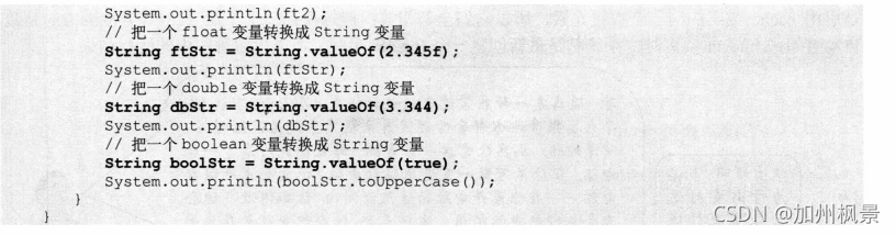 String类也提供了多个重载valueOf(方法,用于将基本类型变量转换成字符串,下面程序示范了这种转换关系。