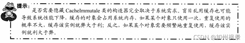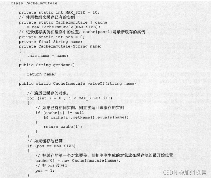 不可变类的实例状态不可改变,可以很方便地被多个对象所共享。如果程序经常需要使用相同的不可变类实例,则应该考虑缓存这种不可变类的实例。毕竟重复创建相同的对象没有太大的意义,而且加大系统开销。如果可能,应该将已经创建的不可变类的实例进行缓存。