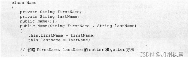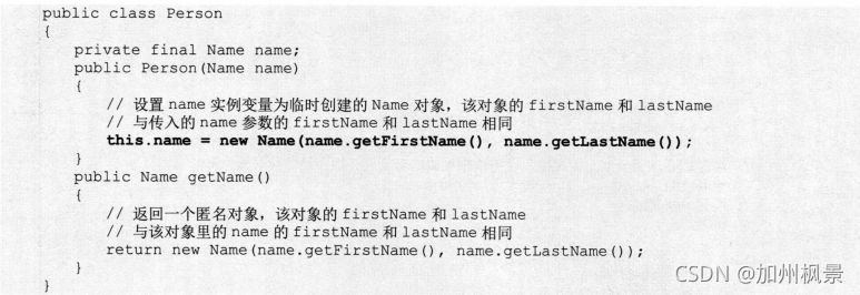 为了保持Person对象的不可变性,必须保护好Person对象的引用类型的成员变量: name, 让程序无法访问到Person对象的name成员变量,也就无法利用name成员变量的可变性来改变Person对象了。为此将Person类改为如下: