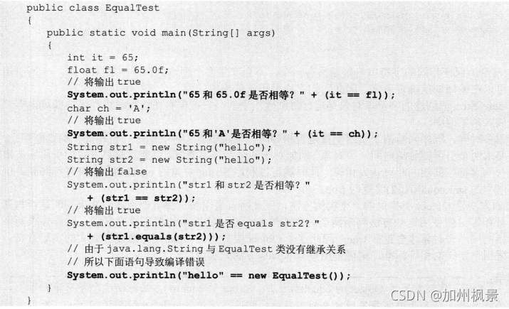 但对于两个引用类型变量,只有它们指向同一个对象时,==判断才会返回true。 ==不可用于比较类型上没有父子关系的两个对象。下面程序示范了使用==来判断两种类型变量是否相等的结果。