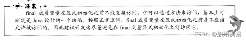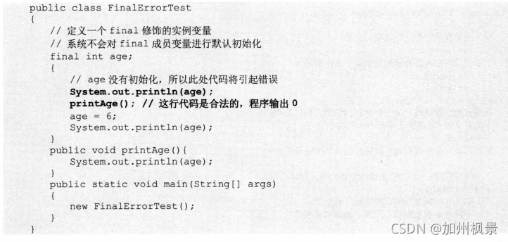 如果打算在构造器、初始化块中对final成员变量进行初始化,则不要在初始化之前直接访问final成员变量;但Java又允许通过方法来访问final成员变量,此时会看到系统将final成员变量默认初始化为0 ( 或'\u0000'、false 或null)。例如如下示例程序。