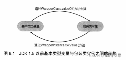 通过上面介绍不难看出,基本类型变量和包装类对象之间的转换关系如图6.1所示。