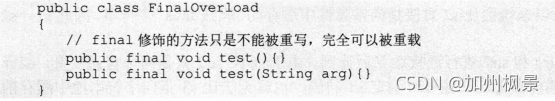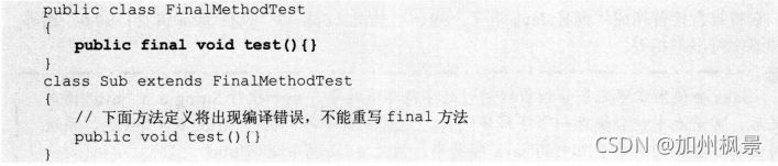 final修饰的方法不可被重写,如果出于某些原因,不希望子类重写父类的某个方法,则可以使用final修饰该方法。