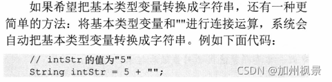 不仅如此,所有的Java对象都可以和字符串进行连接运算,当Java对象和字符串进行连接运算时,系统自动调用Java对象toString()方法的返回值和字符串进行连接运算,即下面两行代码的结果也完全相同。