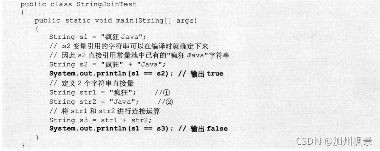 让s1==s3输出true 也很简单,只要让编译器可以对strl、str2 两个变量执行“宏替换”,这样编译器即可在编译阶段就确定s3的值,就会让s3指向字符串池中缓存的“疯狂Java”。也就是说,只要将①、②两行代码所定义的str1、 str2使用final修饰即可。