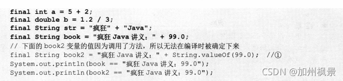 从表面上看,①行代码定义的book2与book没有太大的区别,只是定义book2变量时显式将数值99.0转换为字符串,但由于该变量的值需要调用String类的方法,因此编译器无法在编译时确定book2的值,book2 不会被当成“宏变量”处理。