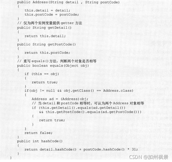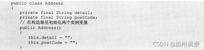下面定义一个不可变的Address类,程序把Address类的detail和postCode成员变量都使用private隐藏起来,并使用final修饰这两个成员变量,不允许其他方法修改这两个成员变量的值。