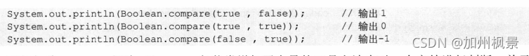 Java 7增强了包装类的功能,Java 7为所有的包装类都提供了一个静态的compare(xxx vall, xxx val2)方法,这样开发者就可以通过包装类提供的compare(xxx vall, xxx val2)方法来比较两个基本类型值的大小,包括比较两个boolean类型值,两个boolean类型值进行比较时,true>false。例如如下代码: