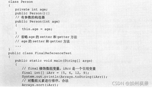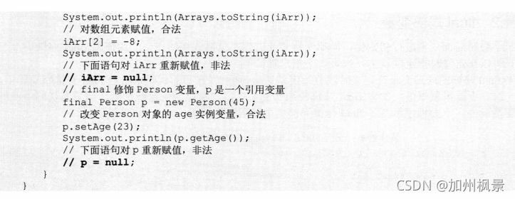 从上面程序中可以看出,使用final修饰的引用类型变量不能被重新赋值,但可以改变引用类型变量所引用对象的内容。例如上面iArr变量所引用的数组对象,final修饰后的iArr变量不能被重新赋值,但iArr所引用数组的数组元素可以被改变。与此类似的是,p变量也使用了final 修饰,表明p变量不能被重新赋值,但p变量所引用Person对象的成员变量的值可以被改变。