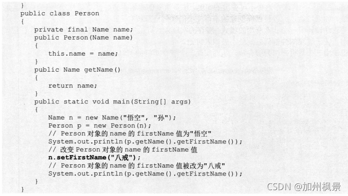 下面程序试图定义一个不可变的Person 类,但因为Person类包含一个引用类型的成员变量,且这个引用类是可变类,所以导致Person类也变成了可变类。