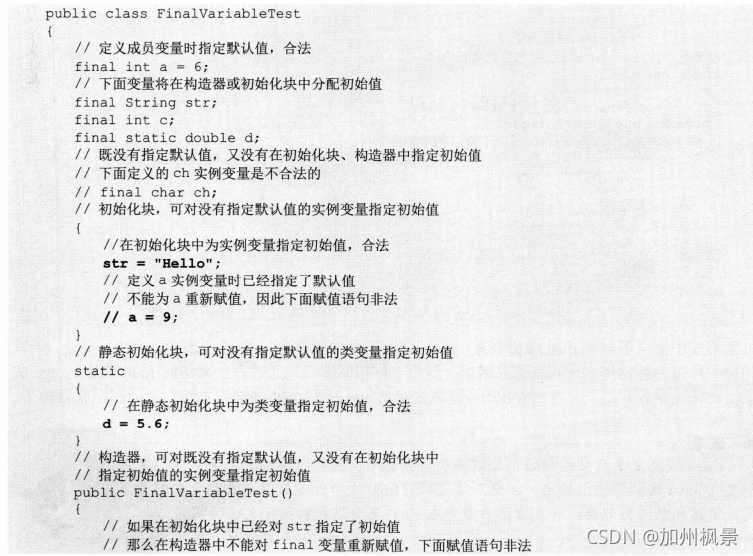 归纳起来,final 修饰的类变量、实例变量能指定初始值的地方如下。