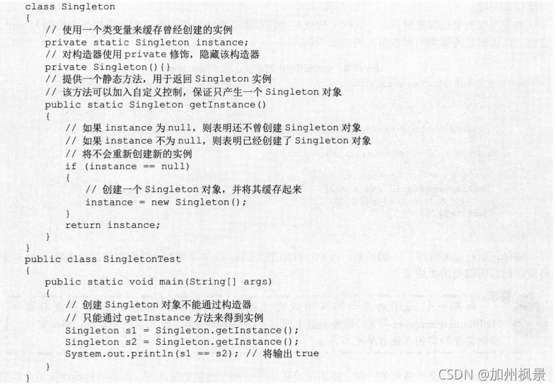 如果一个类始终只能创建一 个实例,则这个类被称为单例类。应该把该类的构造器使用private修饰,从而把改类的所有构造器隐藏起来。