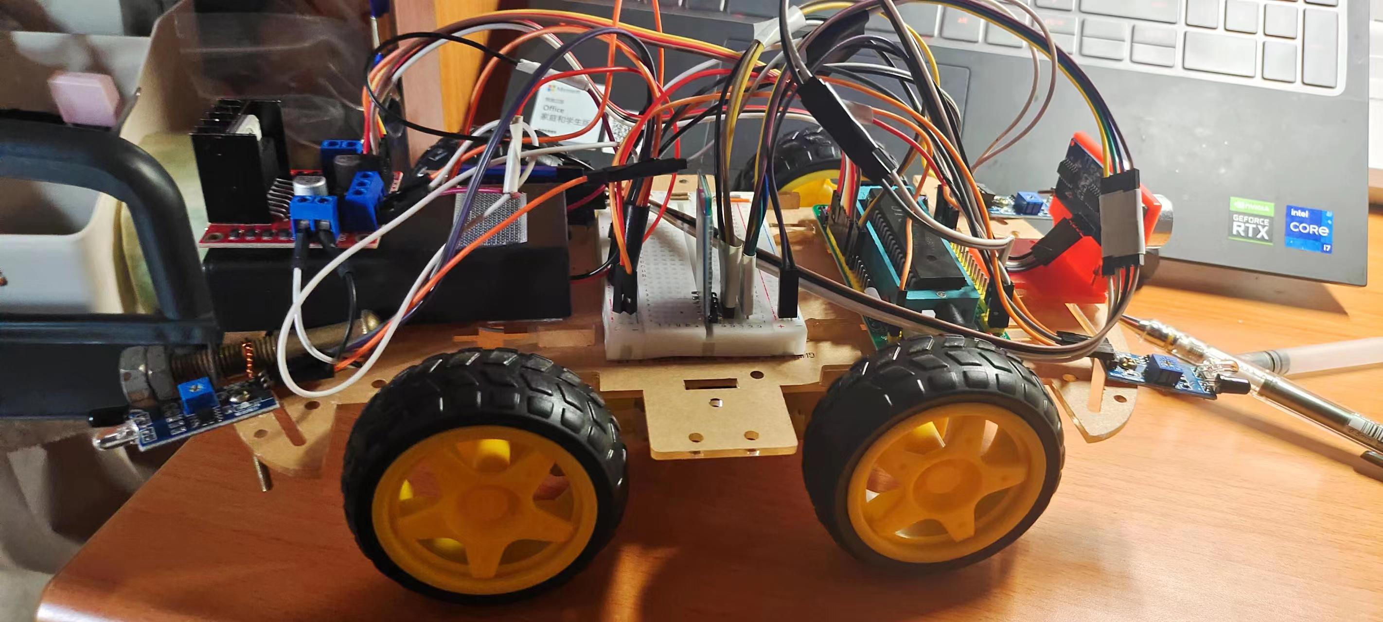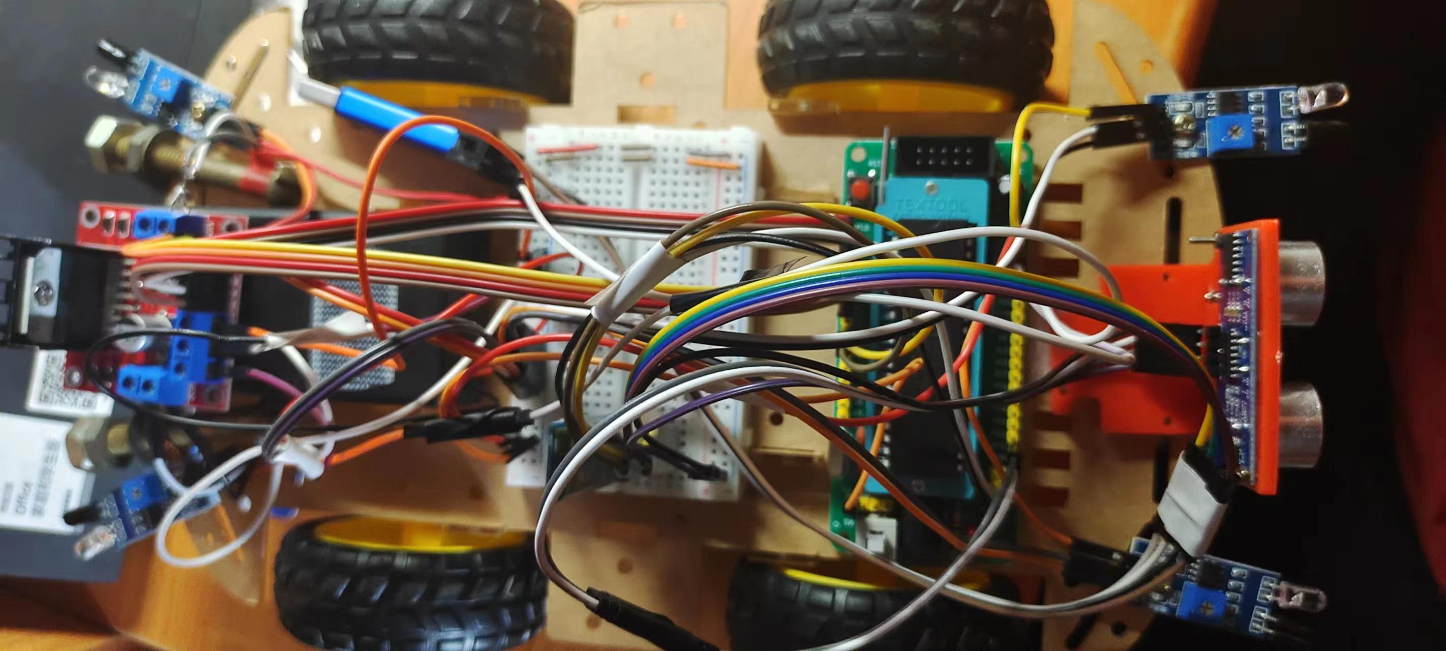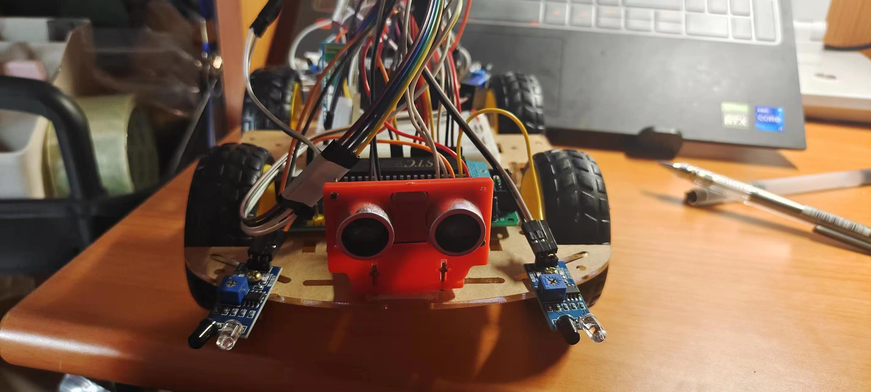红外模块四个角各一个,当前面遇到障碍时,小车后退并停止,当后面遇到障碍时,小车向前行驶并停止。