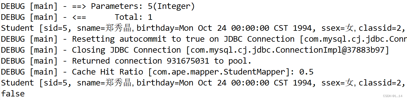 public class Demo3 {public static void main(String[] args) {SqlSession sqlSession1 = DaoUtil.getSqlSession();StudentMapper mapper1 = sqlSession1.getMapper(StudentMapper.class);Student s1 = mapper1.findStudentBysid(5);System.out.println(s1);DaoUtil.closeResource(sqlSession1);SqlSession sqlSession2 = DaoUtil.getSqlSession();StudentMapper mapper2 = sqlSession2.getMapper(StudentMapper.class);Student s2 = mapper2.findStudentBysid(5);System.out.println(s2);DaoUtil.closeResource(sqlSession2);System.out.println(s1 == s2);}}
