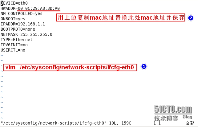 修改网卡配置文件并保存:/etc/sysconfig/network-scripts/ifcfg-eth0 网卡配置文件位置: