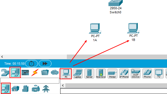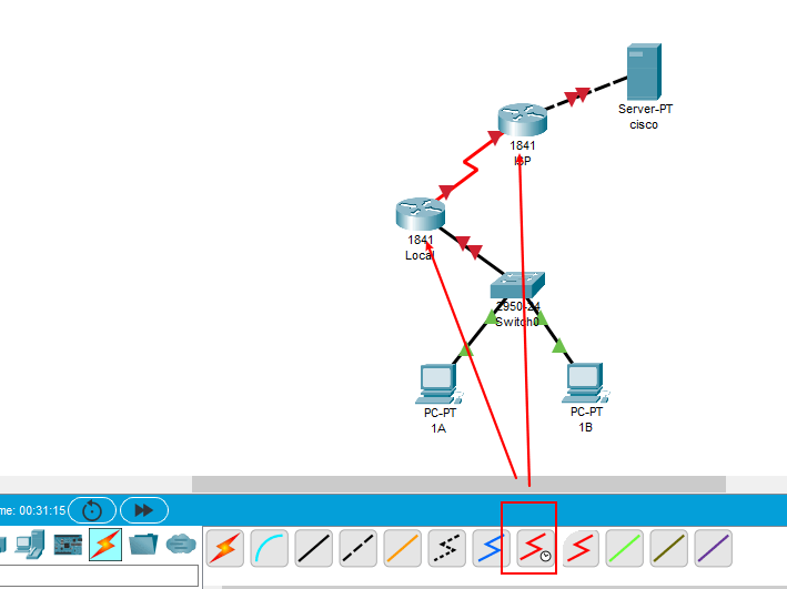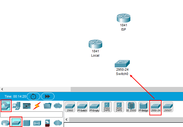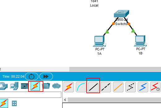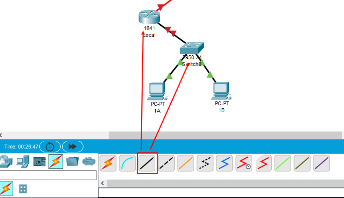 用直通线(Straight-through)分别连接1A和1B的FastEthernet口到交换机的f0/1和f0/2口;用直通线连接Local的f0/0到交换机的 f0/24。选择该线依次点击1A和交换机以及1B和交换机进行连接