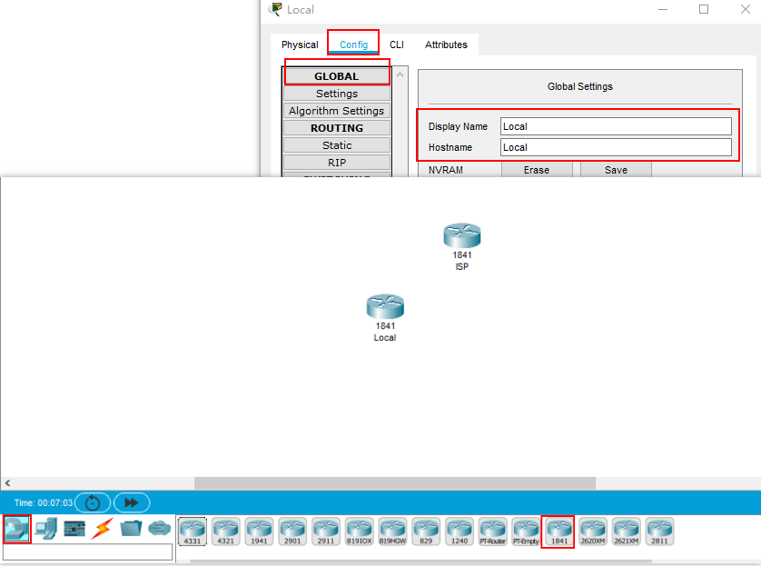 拖放两台1841路由器,并把一台的Display Name和Hostname改为Local,另一台改为ISP(在config->GLOBAL->Settings下设置)