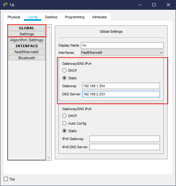 在Config->GLOBAL->Settings下配置1A和1B的Gateway为192.168.1.254(即Local),DNS Server为192.168.2.253(即cisco)