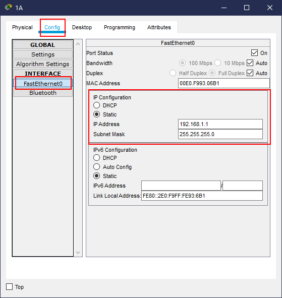 按照上表配置各个设备各端口的IP地址:在Config->INTERFACE找到相应端口,选择Static IP配置模式,配置IP address和子网掩码,同时应该注意使端口置为“On”