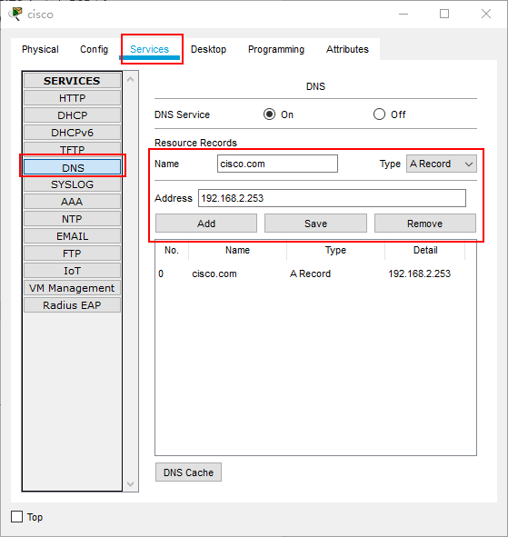 配置cisco上的DNS服务:Config->SERVICES->DNS下,Service置为On,把cisco.com和192.168.2.253添加