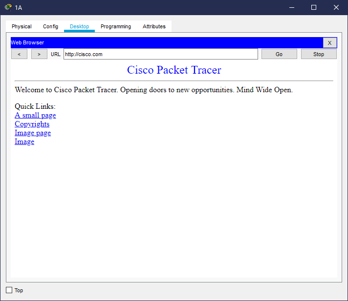 打开1A的浏览器(Desktop->Web Browser),输入cisco.com,如果成功,会返回主页