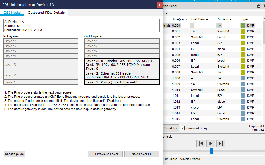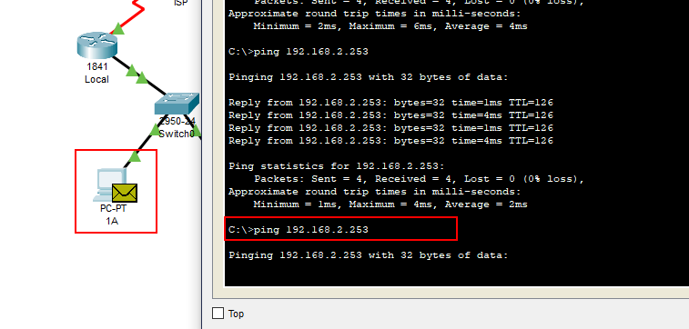 在1A上打开命令行,输入“ping 192.168.2.253”,此时在逻辑工作区可以看到1A上多了一个信封