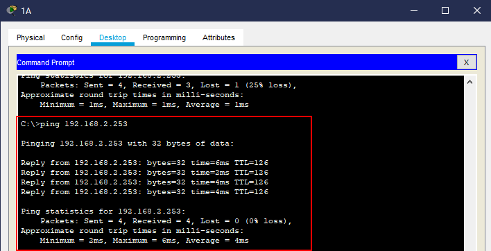 在1A打开命令行(Desktop->Command Prompt),输入“ping 192.168.2.253”,看是否能够连通。以下说明可以连通,配置正确