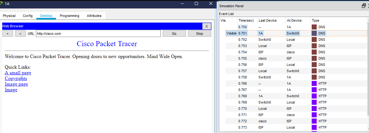 打开1A的浏览器,输入cisco.com,和刚才一样观察信封移动的过程和里面内容的变化。注意DNS和HTTP的配合