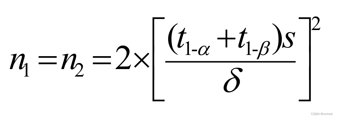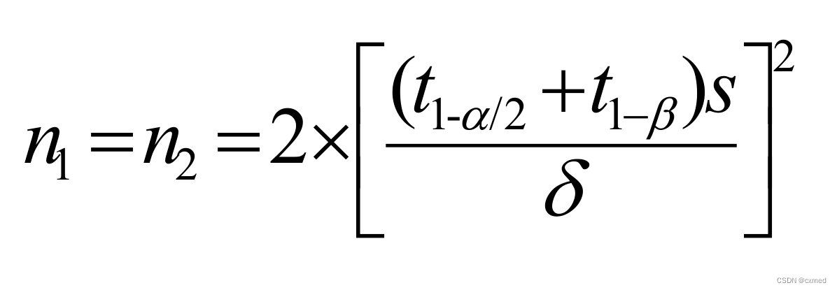 公式中δ为两样本均数之差;S样本标准差;t1-α、t1-β、t1-α/2都是自由度(n1 +n2 -2)下的分位数,在n1和n2求出之前,t1-α、t1-β、t1-α/2都无法确定,需要用迭代法解方程。